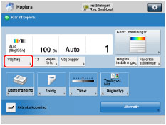 Om [Använd Auto (färg/svartvitt)] i [Välj färginställningar för kopia] är inställt på 'Av', visas inte [Auto (färg/S&V)]. (Se "Begränsa användningen av Auto färgval.".) Om [Använd Fullfärg] i [Välj färginställningar för kopia] är inställt på 'Av', visas inte [Fullfärg]. (Se "Begränsa användningen av Fullfärg".) Om ett svartvitt dokument kopieras i läget Fullfärg räknas lägena Enfärg och Tvåfärg som färgkopior. |