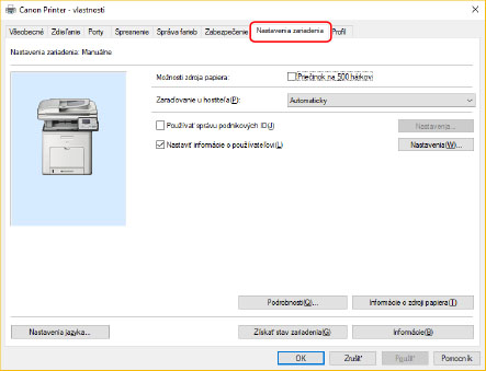 Pomocou týchto nastavení môže ovládač používať funkcie zriadenia a správne tlačiť.