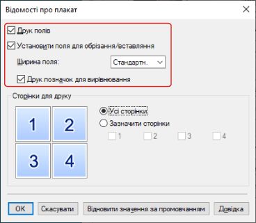 Діалогове вікно [Відомості про плакат]: [Друк полів], [Установити поля для обрізання/вставляння] та [Друк позначок для вирівнювання]