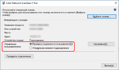 В этом случае заранее сохраните сведения о проверке подлинности в диалоговом окне [Настройки проверки подлинности пользователя] средства Color Network ScanGear 2 Tool, чтобы использовать функцию управления пользователями.