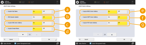 2 | Carry out the necessary settings. ![]() <IPv4>Press <Host Name>, and enter the host name of the machine to register on the DNS server using alphanumeric characters. Press <Domain Name>, and enter the domain name which the machine belongs to using alphanumeric characters (Example: "example.com"). <IPv6>To set the host name and domain name to be the same as IPv4, press <On> in <Use Same Host Name/Domain Name as IPv4>. To set to be different from those of IPv4, press <Off>. To set the host name to be different from IPv4, press <Host Name> and enter the host name of the machine to register on the DNS server using alphanumeric characters. To set the domain name to be different from IPv4, press <Domain Name> and enter the domain name that the machine belongs to using alphanumeric characters. (Example: "example.com"). ![]() If you set <Use DHCPv6> to <On> for the stateful address settings (Setting an IPv6 Address), the manually configured domain name is overwritten. If you set <Use Same Host Name/Domain Name as IPv4> to <On>, the domain name that is retrieved from DHCPv6 server is used. |