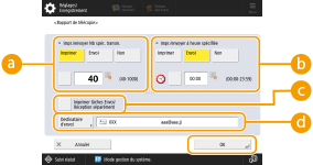 Vous ne pouvez pas configurer les paramétrages pour le rapport de gestion de communication si <Afficher le journal des tâches> dans <Réglages de gestion> est réglé sur <Non>. De plus, si vous changez <Afficher le journal des tâches> dans <Réglages de gestion> de <Non> à <Oui>, <Impr./envoyer Nb spéc. transm.> et <Impr./envoyer à heure spécifiée> dans le rapport de gestion de communication change à <Non>. <Afficher le journal des tâches> |