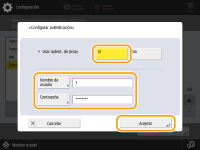 Para utilizar la función de autenticación del servidor proxy, pulse este botón y configure la información de autenticación. En la pantalla que aparecerá, pulse <Sí>, introduzca el nombre de usuario y la contraseña para utilizar la autenticación de proxy, y pulse <Aceptar>.