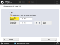 Appuyez sur <Préférences>  <Réseau>  <Réglages ligne secondaire>  <Régl. pr communic. données système>  <Réglages adresse du serveur DNS>.