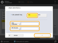Appuyez sur cette option pour définir les informations d'authentification pour utiliser la fonction d'authentification d'un serveur proxy. Appuyez sur <Oui> sur l'écran affiché, saisissez le nom d'utilisateur et le mot de passe pour le serveur proxy, puis appuyez sur <OK>.