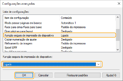 Selecione [Ligado] em [Função segura de impressão do dispositivo] e clique em [OK].