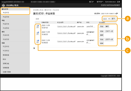 可以检查等待复印或打印的文档的状态。也可以在输出其他文档之前输出某个文档,或取消某个文档。