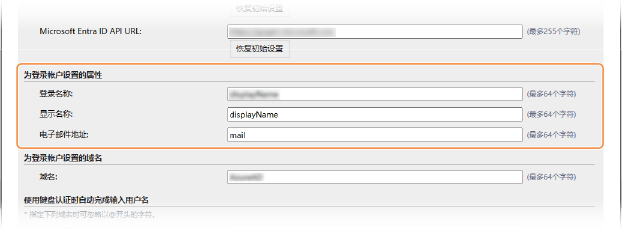 4 | 指定属性。 ![]() [为登录帐户设置的属性] 输入服务器上每个用户帐户的登录名、显示名称和电子邮件地址的属性。 [登录名称] 从下拉菜单中,选择服务器上每个用户帐户的登录名的属性。 * 要指定下拉菜单中未显示的属性,可以直接输入。 [WindowsLogonName]: displayName 是从 Microsoft Entra ID 获取的。displayName 按如下方式更改以创建登录名: 从 displayName 中删除空格和以下字符:* + , . / : ; < > = ? \ [ ] |。 "@" 和任何后续字符都将被删除。 超过 20 个字符的字符串将缩短至 20 个字符或更少。 示例: 当 displayName 是 "user.001@example.com",登录名称变成 "user001"。 [displayName]: 从 Microsoft Entra ID 获取的 displayName 成为登录名称。 [userPrincipalName]: 从 Microsoft Entra ID 获取的 userPrincipalName 成为登录名称。 [userPrincipalName-Prefix]: 从 Microsoft Entra ID 获取的 userPrincipalName 中 "@" 之前的部分成为登录名称。 示例: 当 userPrincipalName 是 "user.002@mail.test",登录名称变成 "user.002"。 [显示名称] 和 [电子邮件地址] 输入服务器上每个用户帐户的显示名称和电子邮件地址的属性。 |