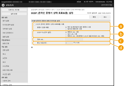 통신 중 상대방으로부터 수신한 인증서가 유효한지 여부를 확인하는 방법에는 두 가지가 있습니다. 기기에 등록된 인증서 해지 목록(CRL)과 비교하는 것과 OSCP(온라인 인증서 상태 프로토콜) 응답기(OCSP를 지원하는 서버)에 대해 문의하는 것입니다. 환경에 따라 인증서 만료를 확인하는 방법을 설정합니다. 관리자만 이 등록을 수행할 수 있습니다.