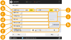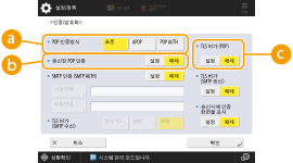 기기 SMTP 서버가 이메일 및 I-팩스를 수신하게 하려면 <설정>을 누릅니다. DNS 서버 기기의 호스트 이름을 등록하지 않으면 SMTP를 통해 수신할 수 없습니다.