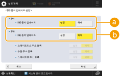 2 | 필요한 설정을 수행합니다. ![]() <IPv4 mDNS 사용>DNS 서버가 없는 환경에서 DNS 기능을 활성화하려면 <설정>을 누릅니다. <mDNS명 사용>을 누르고 영숫자 문자를 사용하여 원하는 mDNS 이름을 입력합니다. <IPv6 mDNS 사용>DNS 서버가 없는 환경에서 DNS 기능을 활성화하려면 <설정>을 누릅니다. mDNS 이름에 대한 IPv4와 같은 설정을 설정하려면 <IPv4와 동일한 mDNS명 사용>에 대해 <설정>을 누릅니다. 다른 설정을 사용하려면 <mDNS명 사용>을 누르고 영숫자 문자를 사용하여 원하는 mDNS 이름을 입력합니다. ![]() <IPv4 mDNS 사용>을 <설정>으로 설정하는 경우 기기가 완전히 슬립 모드로 진입하지 않습니다. <IPv6 mDNS 사용>을 <설정>으로 설정하는 경우 기기가 완전히 슬립 모드로 진입하지 않습니다. |