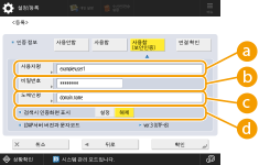IP 주소를 입력할 때, 사용 가능한 DNS 서버가 정방향 조회만 지원하는지 확인합니다. DNS 서버가 정방향 조회만 지원하는 경우 4단계에서 <인증 정보>의 <사용안함> 또는 <사용함>을 누릅니다. <사용함 (보안인증)>을 선택할 때, DNS 서버가 역방향 조회를 지원하는지 확인합니다.