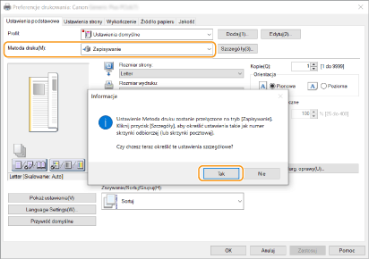 Wybierz [Zapisywanie] z poziomu [Metoda druku] i naciśnij [Yes].