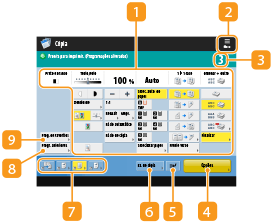 Apresenta o estado das programações, como o rácio de cópia, o formato de papel, o número de cópias, etc. Certifique-se de que confirma as programações aqui para fazer cópias corretamente. Para alterar as programações, carregue no botão sob a secção de apresentação.