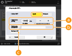 SNTP é um protocolo que permite ajustar a hora utilizando um servidor de horas na rede. O SNTP é utilizado quando é necessário ajustar a hora entre a máquina e o servidor nos casos em que a autenticação de segurança é efetuada no acesso a um servidor LDAP. Programe a diferença de tempo (fuso horário) previamente porque as ações baseiam-se na Hora Universal Coordenada (UTC).