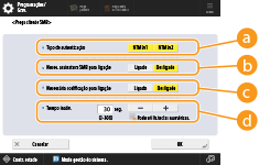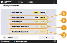 Quando o item <Necessária codificação para ligação> está programado para <Ligado>, a máquina só consegue estabelecer ligação a servidores SMB compatíveis com comunicação codificada SMB v3.0. Quando as opções <1.0> e <2.0> estão programadas para <Ligado> no item <Especificar versão cliente SMB>, mas a opção <3.0> não está programada para <Ligado>, a máquina não consegue estabelecer ligação a servidores SMB que não sejam compatíveis com comunicação codificada SMB v3.0.