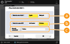 A Comunidade Dedicada é uma comunidade predefinida para software de Gestão de Dispositivos Canon. Para utilizar a Comunidade Dedicada, carregue em <Prog. comun. dedicada.>. Para especificar uma comunidade geral, carregue em <Prog. nome comunidade 1> ou em <Prog. nome comunidade 2>. Para obter detalhes, consulte o manual do software que está a utilizar.