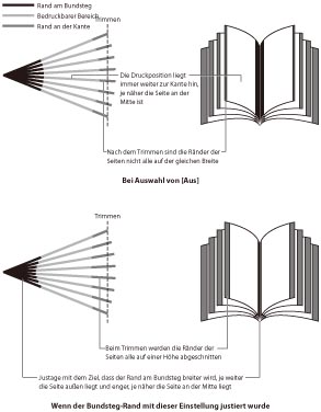 Wenn [Auto] ausgewählt ist, werden die Bundstegränder automatisch basierend auf der Anzahl der Seiten und der Papierstärke justiert.