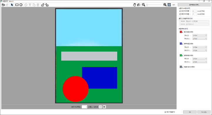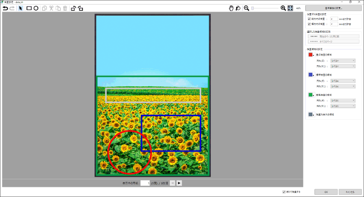 検査領域が1つも設定されていない検査ジョブを実行した場合、画像の検査は行われません。ページ全体を検査対象にする場合は、ページ全体が含まれる領域を設定してください。 検査対象の印刷ジョブに、部ごとに変わる番号や文字列、バリアブルデータなどが含まれる場合は、これらが印刷される領域を[検査対象外の領域]に設定してください。 |