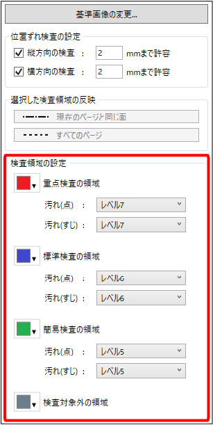 表示中のページや、手順6~7で設定した領域の適用範囲によらず、すべてのページの同じ種類の検査領域の検査レベルが、ここで設定したレベルになります。1つの検査ジョブの中に同じ種類の検査領域が複数ある場合に、それぞれに異なる検査レベルを設定することはできません。 |