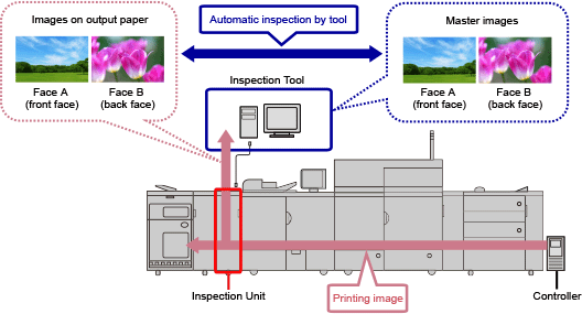 The Inspection Tool scans the image that was output to the paper and compares it to the master image. If the comparison result exceeds the inspection standards, it is judged that there are no problems in the quality.