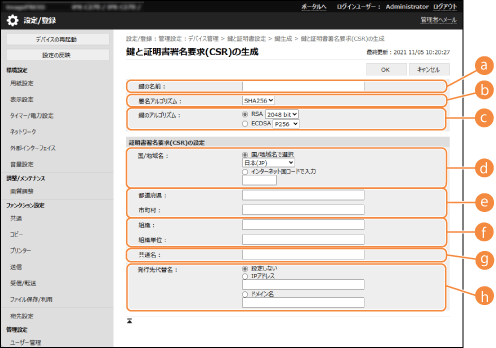 本機で自己生成した証明書は認証局の署名がないため、通信相手によっては通信エラーとなってしまうことがあります。認証局の署名が付いた証明書を発行してもらうためには、証明書署名要求(CSR:Certificate Signing Request)のデータが必要です。CSRは、管理者がリモートUIから生成することができます。