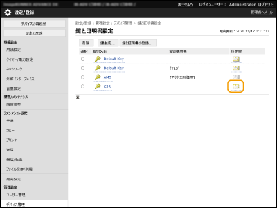 [デバイス管理]  [鍵と証明書設定]をクリックする