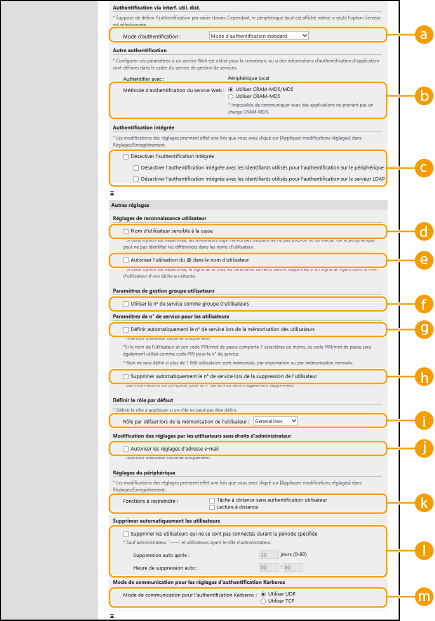 Cochez la case pour [Utiliser la fonction d'authentification des utilisateurs] et spécifiez les réglages nécessaires.