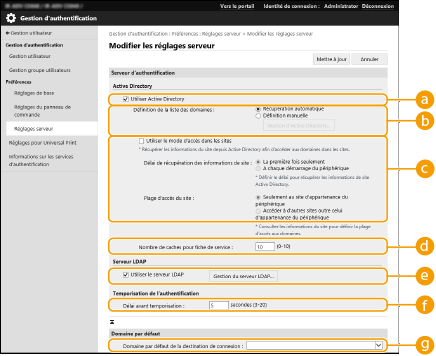 Spécifiez le laps de temps défini pour la connexion au serveur d'authentification et le laps de temps défini pour l'attente d'une réponse. Lorsque [Enregistrer les informations d'authentification pour les utilisateurs connectés] est activé, si vous ne pouvez pas vous connecter dans le laps de temps spécifié ici, la tentative de connexion s'effectue à l'aide des informations d'authentification enregistrées dans la mémoire cache.