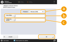 2 | Spécifiez le dossier de base et appuyez sur <OK>. ![]() <Protocole>Sélectionnez le protocole à utiliser pour accéder aux dossiers personnels. <Nom d'hôte>Saisissez le nom d'hôte ou l'adresse IP de l'ordinateur où vous voulez créer le dossier de base. <Chemin du dossier>Saisissez le chemin d'accès au dossier de base. Par exemple, saisissez "utilisateurs\public\partagé" pour un dossier de base créé dans un sous-dossier nommé "Partagé" dans le dossier "Public" sur le lecteur C : (chemin : "C:\utilisateurs\public\partagé"). ![]() Il est possible que vous ne puissiez pas spécifier le chemin d'accès s'il y a trop de niveaux de dossier. |
