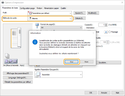 Sélectionnez [Attente] depuis [Méthode de sortie] et cliquez sur [Oui].