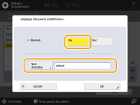 Le mode PASV est un mode de communication FTP utilisé pour le transfert de fichiers. Appuyez sur <Oui> pour ce réglage afin de permettre à l’appareil de se connecter à un serveur FTP, même lorsqu'il est protégé par un pare-feu. Avant de transférer des fichiers, vérifiez que le serveur FTP est réglé sur le mode PASV.