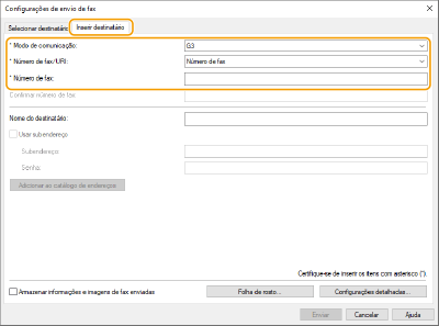Clique na aba [Inserir destinatário] e especifique o modo de comunicação e o número de fax que você está usando.