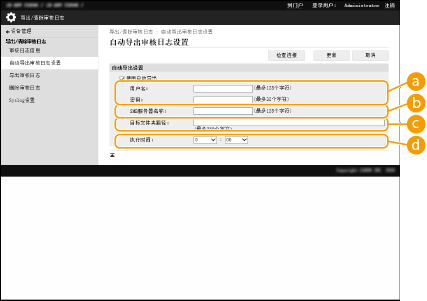 自动导出审核日志成功后,将删除收集的审核日志。审核日志无法手动删除。 成功自动导出和删除审核日志后,生成每个日志。如果下一个自动导出时间其它日志收集没有发生,则不会自动导出审核日志。 可以从“远程用户界面”手动导出审核日志。将日志作为文件导出 如果自动导出失败,本机将重试数次。如果自动导出仍失败,本机的控制面板上将显示错误信息。 指定Windows Server 2012或更高版本,或者Windows 8或更高版本的SMB服务器。 如果本机关闭,即使在指定时间,也不会执行导出。而且,当本机恢复时,也不会执行。 如果本机处于睡眠模式,将会在指定时间自动恢复并执行导出。 注意!如果使用的服务器不支持SMB v3.0加密通信,审核日志数据以未加密的状态穿过通信路径直至被自动导出。 视环境而定,执行自动导出日志的时间可能会晚于指定时间。 |