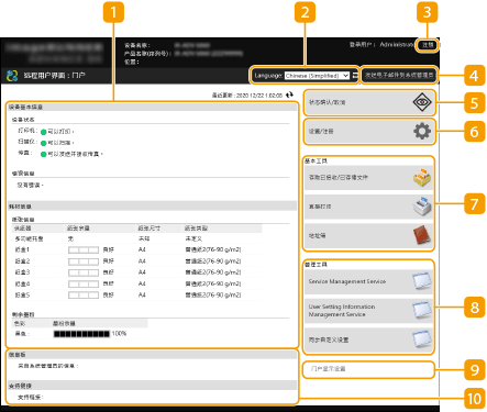 登录到“远程用户界面”时,将显示如下所示的门户页面。本节介绍门户页面上显示的项目及基本操作。