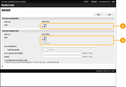 查看同步的通信日志可以从同步自定义设置屏幕上查看通信日志。也可以将日志下载为文件。 当服务器机器不能临时通信时,将记录为“警告”级别。 当超过可注册的数据数量上限或使用服务器机器认证失败时,将记录为“错误”级别。 简单同步设置可以从相同路由器范围内的佳能多功能打印机的控制面板上启动同步自定义设置。 对于服务器机器: 按 (设置/注册) <管理设置> <设备管理> 将<同步自定义设置(服务器)>设为<启用>。对于客户端机器: 按 (设置/注册) <管理设置> <设备管理> 将<同步自定义设置(客户端)>设为<启用>。如果机器用作服务器/客户端机器,同样将<同步自定义设置(客户端)>设为<启用>。 必须启用“用户认证”作为认证方法。 当取消同步时需注意当客户端机器取消同步自定义设置时,该客户端机器将不能取回在服务器机器中注册的每位用户的设置。因此请注意:如果某台机器之前是客户端机器,在同步自定义设置被取消之后,其个性化数据不能拥有最新的数据。 |