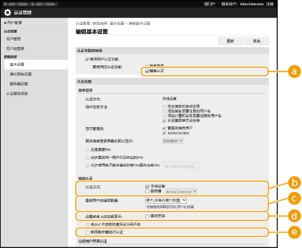 选择[使用用户认证功能]复选框,然后指定所需的设置。