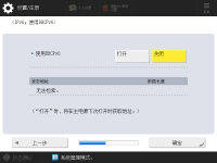 指定网络连接的设置。 ![]() ![]() 为<使用IPv4>或<使用IPv6>按<打开>,并按<下一步>。您还可以同时使用IPv4和IPv6。 如果为<使用IPv4>和<使用IPv6>按<关闭>,并按<确定>,跳过网络设置并继续执行步骤10。 ![]() 如果为<使用IPv4>按<打开>,指定以下设置。 ![]() 要自动获取IP地址,按<DHCP>或<自动IP>,并按<下一步>或<确定>。 要手动设置IP地址,清除<DHCP>或<自动IP>的选择,按<IP地址>、<子网掩码>和<网关地址>输入每个值,并按<下一步>或<确定>。 有关IPV4地址设置的信息,请参阅设置IPv4地址。 ![]() 如果为<使用IPv6>按<打开>,指定以下设置。 ![]() 按<打开>使用无状态地址,或者按<关闭>不使用无状态地址并按<下一步>。 有关IPv6地址的信息,请参阅设置IPv6地址。 ![]() 指定无状态地址后,指定以下设置。 ![]() 按<打开>使用手动地址,或者按<关闭>不使用手动地址并按<下一步>。 要使用手动地址,按<手动地址>、<前缀长度>和<默认路由器地址>输入每个值。 ![]() 指定手动地址后,指定以下设置。 ![]() 按<打开>使用DHCPv6,或者按<关闭>不使用DHCPv6并按<确定>。 | |