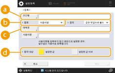 <동작>조건과 일치하는 문서를 처리하는 방법을 선택합니다. <공유 작업으로 홀드>를 선택하면 <대체 ID>를 설정하여 인쇄 시에 로그로 출력할 사용자 이름을 지정할 수 있습니다. 문서를 폐기하려면 <취소>를 선택하십시오. <동작 대상>작업 대상에 의해 지정된 값 또는 지정되지 않은 값을 설정할 수 있습니다. | ||||||