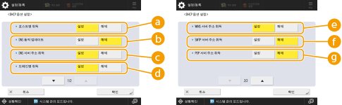 2 | 필요한 설정을 수행합니다. ![]() <IPv4 mDNS 사용>DNS 서버가 없는 환경에서 DNS 기능을 활성화하려면 <설정>을 누릅니다. <mDNS명 사용>을 누르고 영숫자 문자를 사용하여 원하는 mDNS 이름을 입력합니다. <IPv6 mDNS 사용>DNS 서버가 없는 환경에서 DNS 기능을 활성화하려면 <설정>을 누릅니다. mDNS 이름에 대한 IPv4와 같은 설정을 설정하려면 <IPv4와 동일한 mDNS명 사용>에 대해 <설정>을 누릅니다. 다른 설정을 사용하려면 <mDNS명 사용>을 누르고 영숫자 문자를 사용하여 원하는 mDNS 이름을 입력합니다. ![]() <IPv4 mDNS 사용>을 <설정>으로 설정하는 경우 기기가 완전히 슬립 모드로 진입하지 않습니다. <IPv6 mDNS 사용>을 <설정>으로 설정하는 경우 기기가 완전히 슬립 모드로 진입하지 않습니다. |