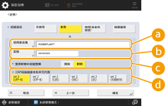 2 | 輸入使用者名稱和密碼,並進行必要的設定。 ![]() <使用者名稱>輸入在 LDAP 伺服器註冊的本機使用者名稱(範例:「user1」)。 <密碼>輸入 LDAP 伺服器上註冊的密碼。輸入密碼時,將顯示 <確認> 以供確認。再次輸入密碼。 <網域名稱>輸入本機的網域名稱。 <搜尋時顯示認證螢幕>搜尋接收者時,若要顯示使用者名稱和密碼輸入畫面,請按 <開啟>。 |