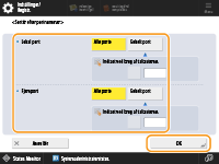 Tryk på <Sortér efter portnummer> for at bruge portnumre ved angivelse af de porte, IPSec skal anvendes på. Vælg <Alle porte> for at anvende IPSec på alle portnumre. For at anvende IPSec på et bestemt portnummer skal du trykke på <Enkelt port> og indtaste portnummeret. Efter angivelse af portene skal du trykke på <OK>. Angiv porten på denne maskine i <Lokal port>, og angiv porten for kommunikationspartneren i <Fjernport>.