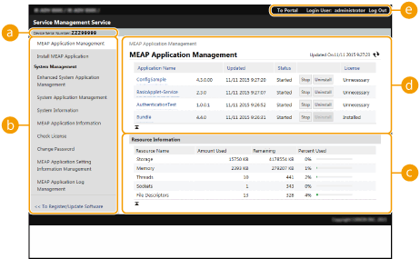 [MEAP Application Management]: Het beheer van geïnstalleerde MEAP-toepassingen wordt voornamelijk op deze pagina bijgehouden.