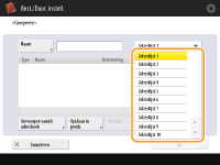 (e-mail), (fax), (I-fax) of (file) om de bestemmingen te filteren die in de adreslijst worden weergegeven ( ). Druk op <Alle> om alle opgeslagen bestemmingen weer te geven. Bestemming