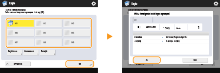 Als de bovenstaande berichten worden weergegeven bij het registreren van <Favorieteninstellingen> voor <Scannen en verzenden>, voert u de volgende handelingen uit. Als u favoriete instellingen wilt oproepen zonder een wachtwoord in te voeren, drukt u op <Ja> om de wachtwoordinformatie te bewaren.
