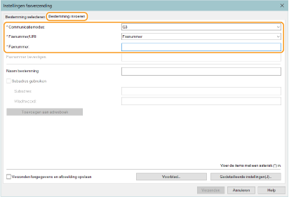 Klik op het tabblad [Bestemming invoeren] en geef de communicatiemodus en het faxnummer op dat u gebruikt.