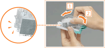 Steek het lipje van de nietpatroon in de nietpatroonhouder en laat de nietpatroon zakken om deze te bevestigen.