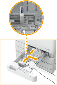 Verschuif de geleiders tot u een klik hoort. Als de linker geleider en de voorste geleider niet juist worden ingesteld, zal het papierformaat niet juist op het touch panel display verschijnen. De geleiders dienen tevens juist te worden ingesteld om papierstoringen, verontreinigde afdrukken en of verontreiniging van de binnenzijde van de machine te voorkomen.