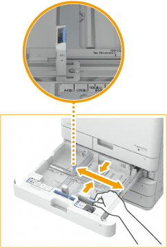 Druk op het bovenste gedeelte van de voorste geleider en verschuif hem zodat die op een lijn met de formaatindicator voor het te plaatsen papier.