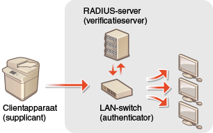 Als een apparaat probeert verbinding te maken en begint te communiceren met het 802.1X-netwerk, moeten de gebruikersgegevens worden geverifieerd om er zeker van te zijn dat de verbinding tot stand wordt gebracht door een bevoegde gebruiker. Hiertoe worden verificatiegegevens verzonden naar en gecontroleerd door een zogenaamde RADIUS-server, die op basis van het verificatieresultaat communicatie met het netwerk toestaat of weigert. Als de verificatie mislukt, wordt de externe toegang tot het netwerk geblokkeerd door een LAN-switch (of een toegangspunt). Het apparaat kan als een clientapparaat worden aangesloten op een 802.1X-netwerk.